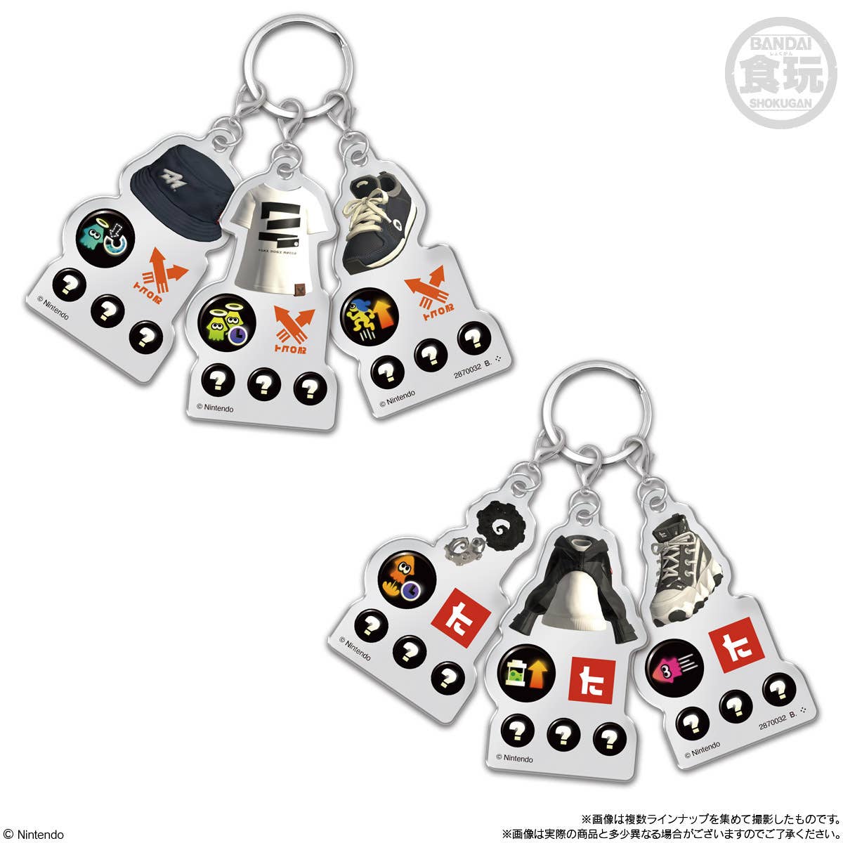 Bandai's new Triple Charm set features gear from "Splatoon 3," and can be customized with stickers! Each item includes three acrylic charms attached to a key ring; the charms represent the Headgear, Clothing, and Shoes categories found in the game, along with two Gear Power stickers. Customize the acrylic charms by applying your favorite Gear Power stickers! Each charm features a lobster-claw clasp, too, so you can freely mix and match the charms to create your own unique outfit combinations. There are ten different items to collect and trade, and each one comes with a piece of soda-flavored gum; they're randomly packed in boxes of ten. Order yours today!