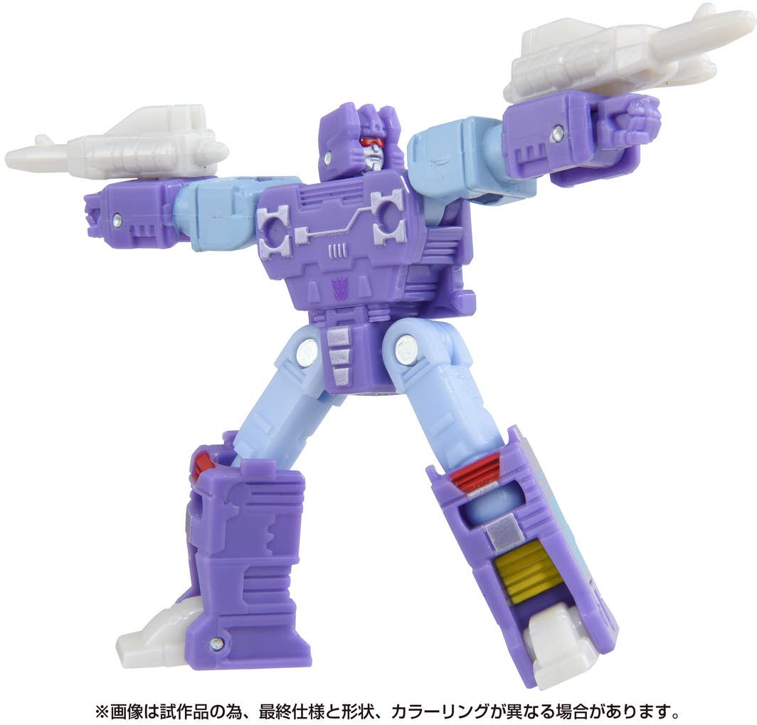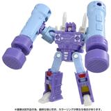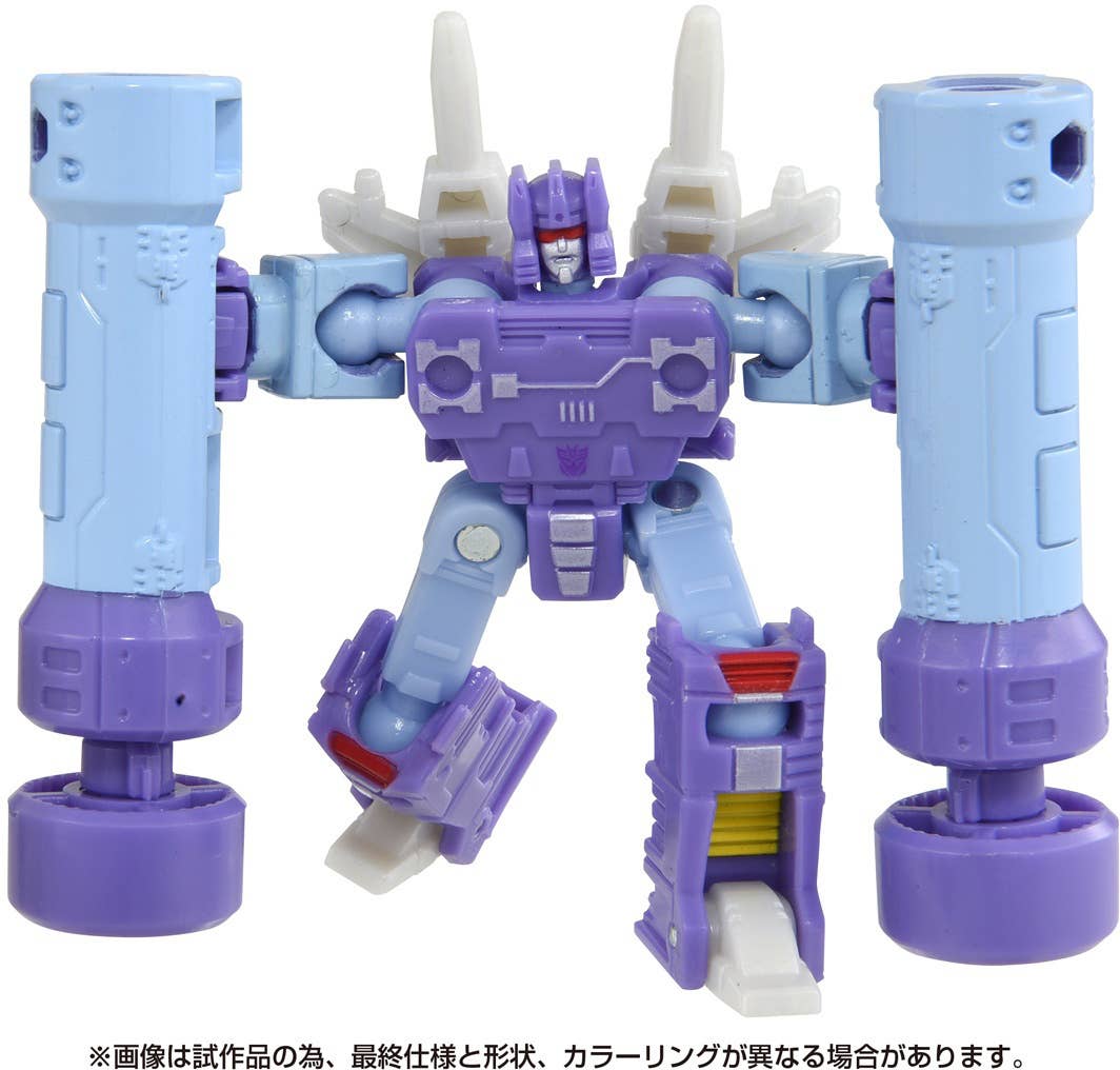 Rumble is a Decepticon special destroyer used by Soundwave; he transforms into a cassette tape. He has a strong animosity towards Autobots and is very aggressive, short-tempered and twisted, but he is very obedient to Megatron. The hammers equipped on both of his arms have the power to split the earth! Two small guns are included too. Order him for your own collection today!
