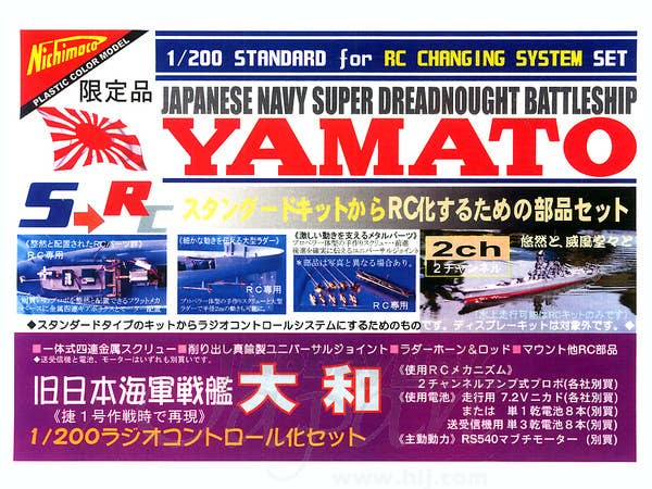 Radio control enabler unit for Nichimo's massive 1/200-scale battleship Yamato kit. This is a shipboard radio control enabler unit that goes inside the model itself, featuring , not a hand-held "propo" controller. Includes metal mounting base for the electronics (sold separately), gearbox, large rudder, and metal propellers and universal joints.