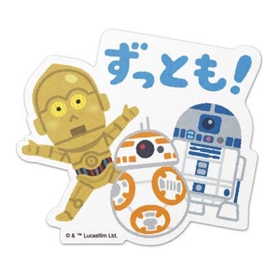 Drawn by illustrator Takashi Mifune, this sticker depicts BB-8, C-3PO, and R2-D2 from "Star Wars".