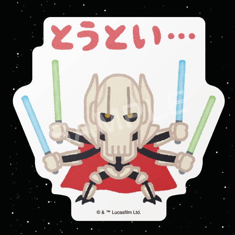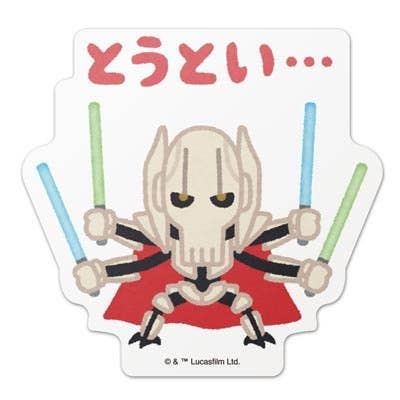 Drawn by illustrator Takashi Mifune, this sticker depicts General Grievous armed and ready for battle with the words "At last..." in Japanese.
