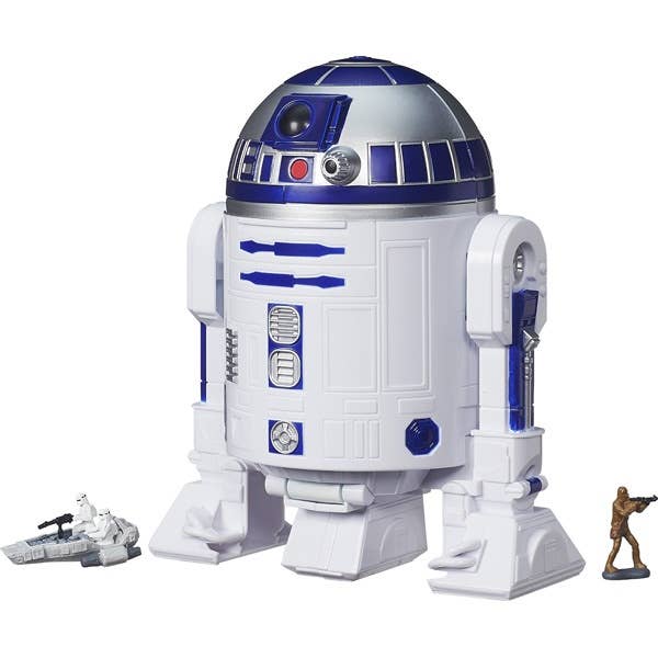 This R2-D2 figure opens up into an icy planet battle scene! Includes a First Order Snowspeeder and a figure of Chewbacca.