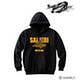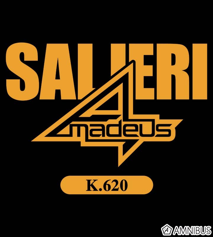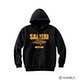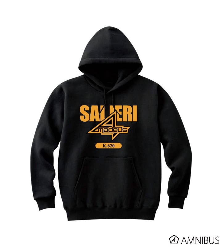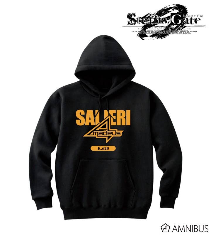 Here's a black pullover hoodie from "Steins;Gate," made with 100%. Features include drawstring adjusters for the hood, a front pocket, and a front-facing orange lettering as its design: "Salieri" and "Amadeus."