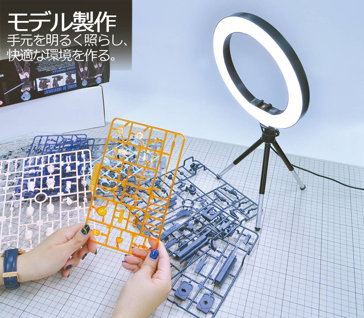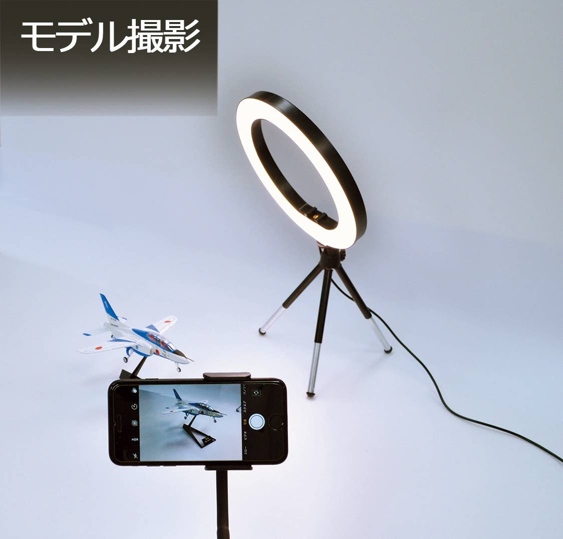 This useful ring light features a ten-step color adjustment (white/bulb color/daylight) via the remote control built into the included USB cable; it's useful for photographing finished models, shooting videos, and using as a lamp when building models! Features a ball-joint-type pan head; a mini tripod is also included to stand it up. Order yours today!