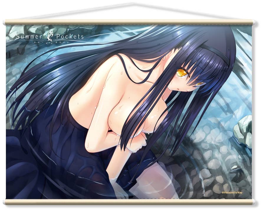"Summer Pockets" brings to you a new line of wall tapestries for you to enjoy! This wall tapestry features full color artwork of the character Kamome Kushima without her shirt, sitting in shallow water. This wall tapestry is a great addition to any fan's collection, order today!