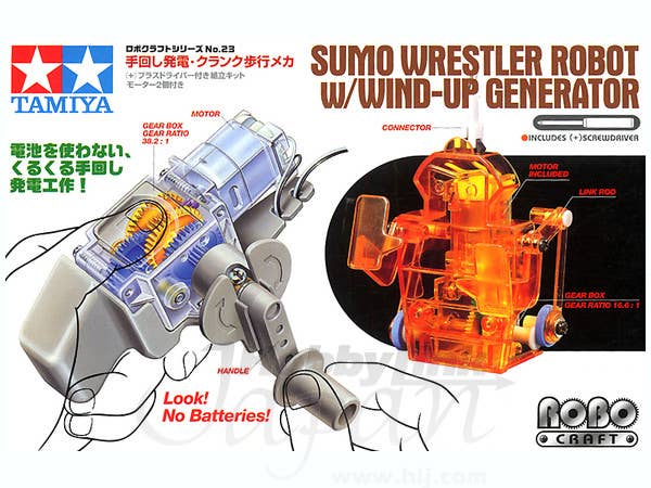 Here's an educational and fun model of a robotic Sumo wrestler that's powered by a hand-cranked power generator! Electricity is generated by cranking the handle, which operates a gear-increasing generator system. Turn the handle clockwise to go forward, and counter-clockwise to move backward. The cranking speed directly affects the speed of the robot's movement! The little legs feature sure-grip rubber to move forward and backward, and the arms are connected to replicate the typical Sumo pushing action! Generates about 2.5V (unloaded). Includes two motors. Assembly is required; a screwdriver is included.