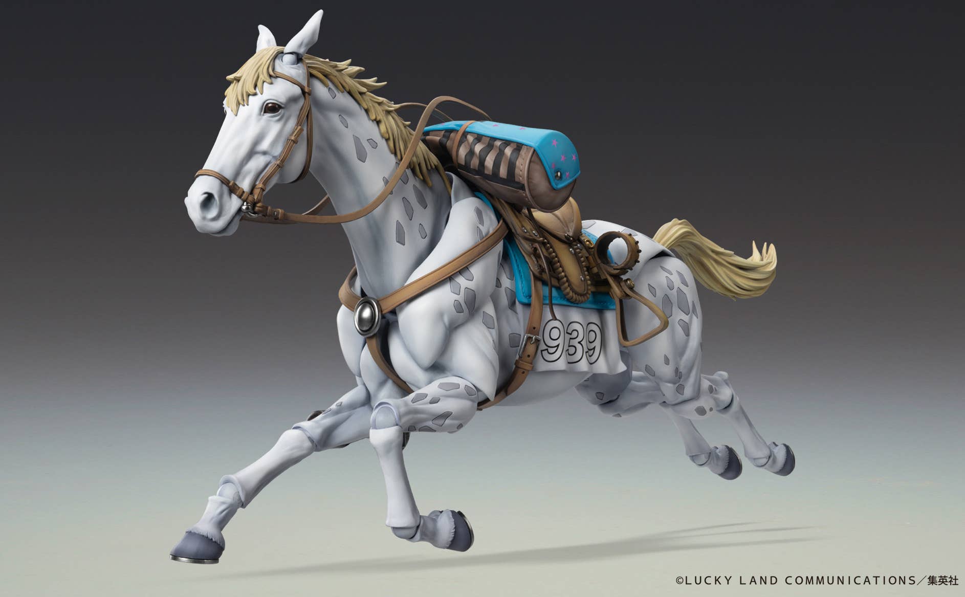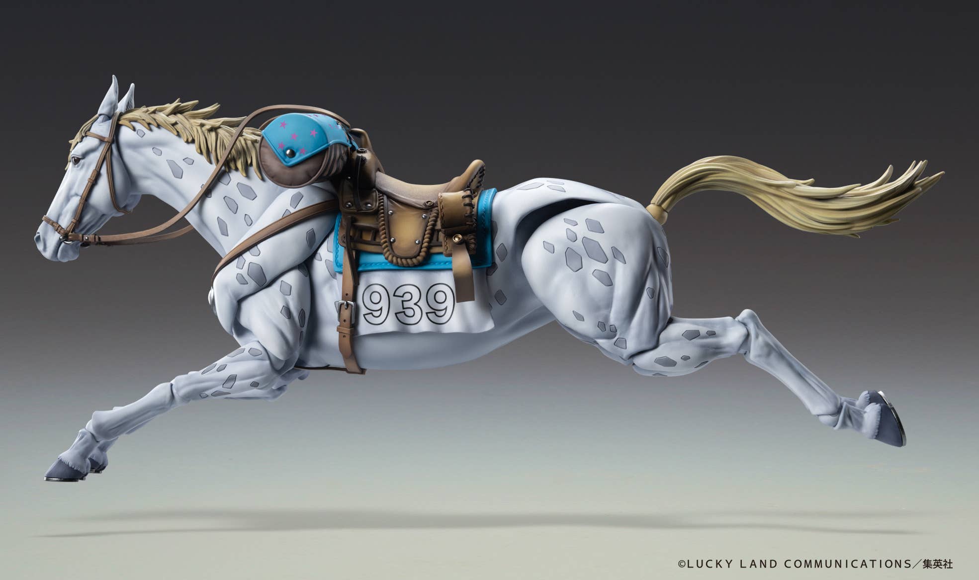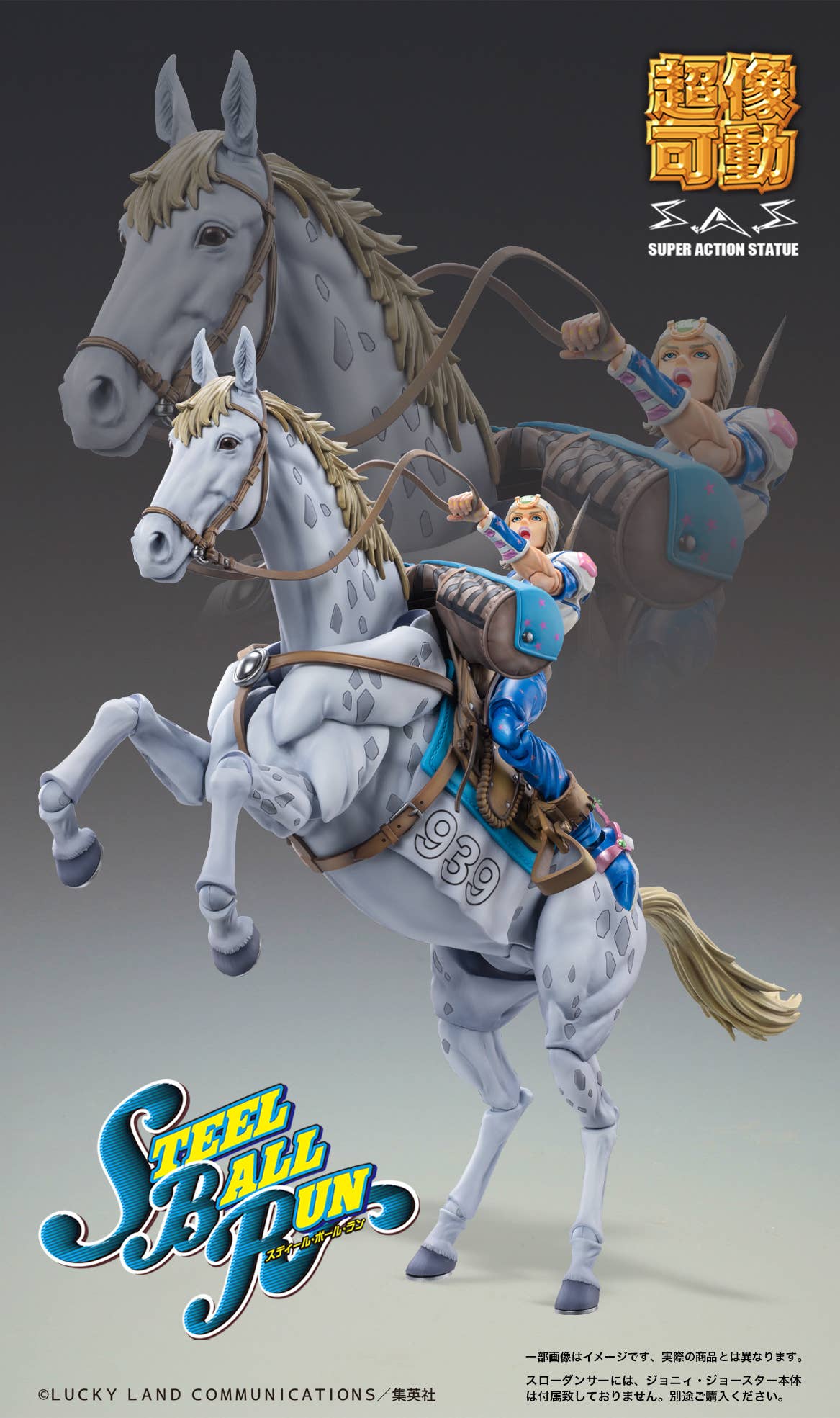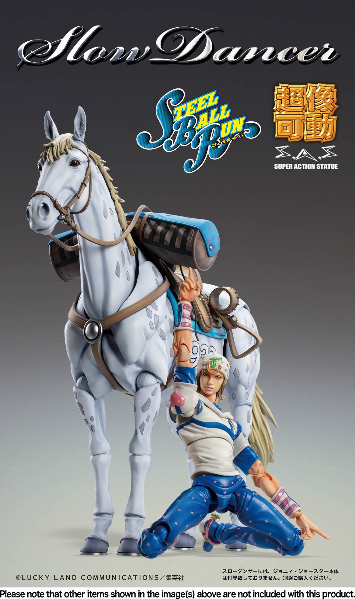 Slow Dancer from "JoJo's Bizarre Adventure Part 7: Steel Ball Run" finally joins the "Super Action Statue" lineup from Medicos! The musculature and skin texture are expressed through meticulous sculpting and painting, accurately reproducing Slow Dancer's spotted pattern and even the smallest details. The legs, tail, and ears are all articulated for dynamic and lively poses, and multiple interchangeable hands for Johnny Joestar are included. Effect parts are also included to recreate the attack where Johnny's Stand, Tusk Act 2, rotates like a drill, as are parts to recreate Johnny riding Slow Dancer and holding the reins! A base for display is included. Order yours today!
