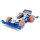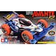 Super mini 4WD Super Avante with a white injection plastic body and orange rubber tires; stickers are included for detail. Snap-fit assembly -- no glue required. Motor is included; 2 AA batteries are required but not included, and required tools (screwdriver, side cutters for plastic, and a modelling knife) are also not included. Mini 4WD are made for racing specifically on Tamiya racing circuits.