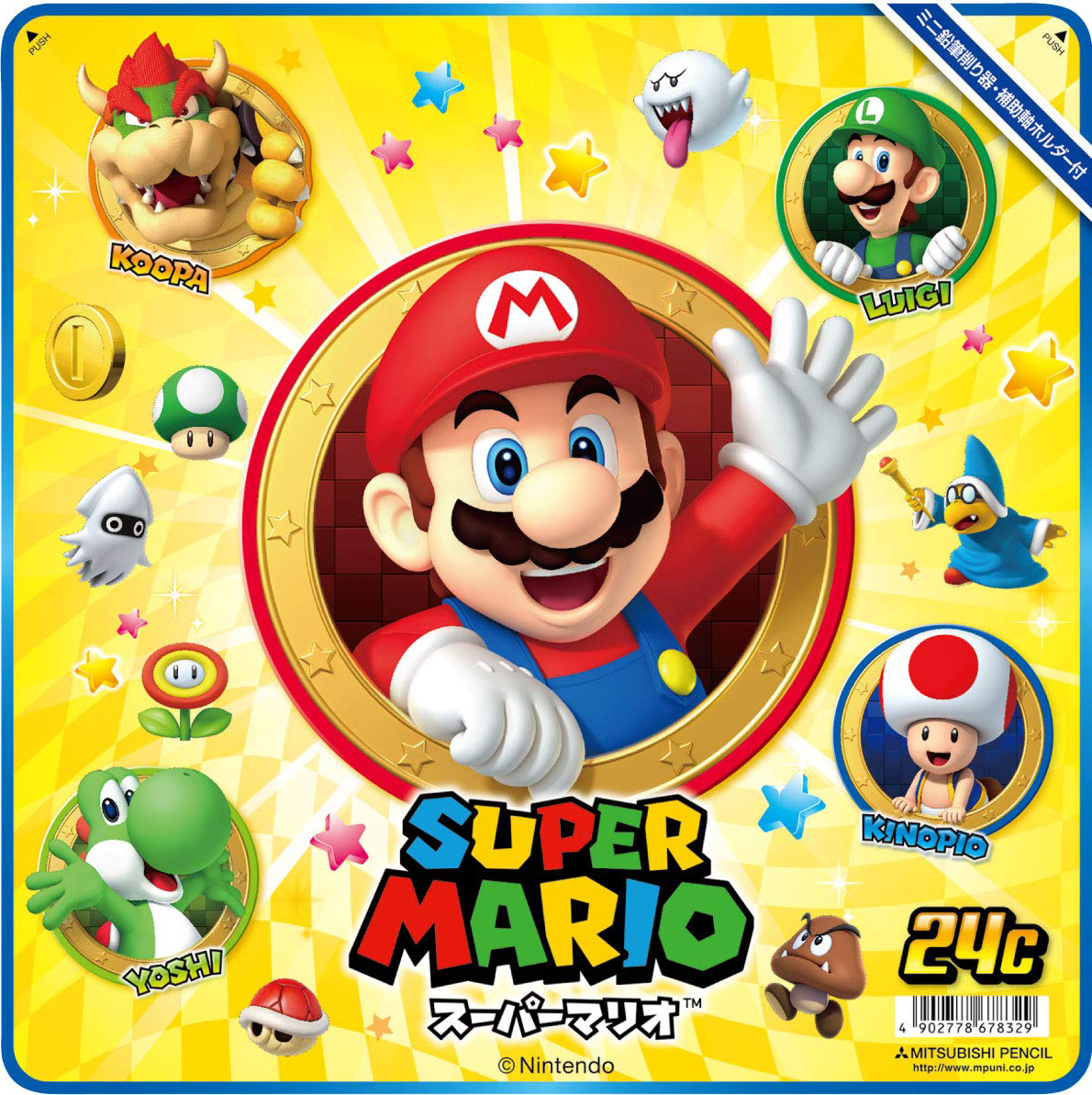 This colored pencil set features a metal case with "Super Mario" characters Mario, Yoshi, Luigi, Bowser, Toad, and more on the cover. Includes 24 different colored pencils. Order today!