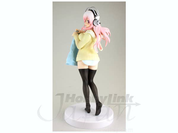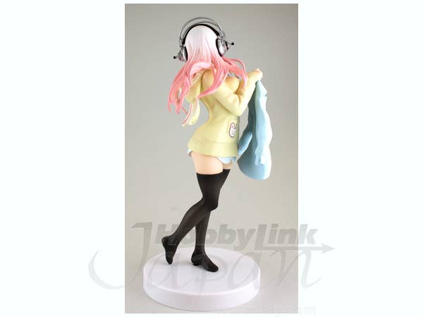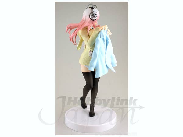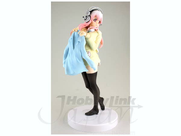 Super Sonico shakes out a blue blazer! She's already wearing a comfortable yellow sweater, although she's not wearing any pants at the moment. She's a game-prize item from FuRyu, and is about 21cm tall; a base is provided too. Invite her into your collection today!