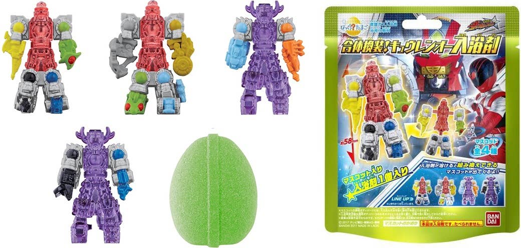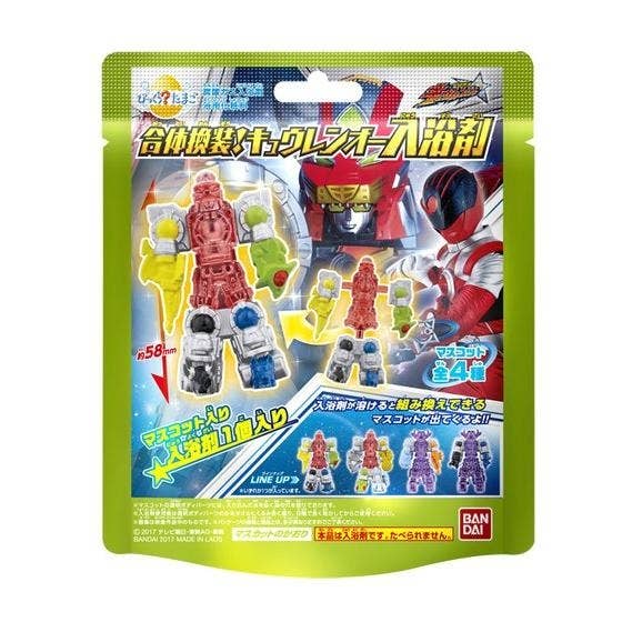Kyuranger is here for bathtime fun! Place one of these Suprise Egg bath balls in water, and when it melts, it will reveal one of four possible groups of combinable mascots: KyurenOh Set A, KyurenOh Set B, RyuteiOh Set A, and RyuteiOh Set B! The bath ball itself is about 75g, muscat scented, and will turn the bath water green. Sold by the randomly packed box of 15!