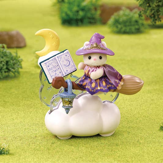 Epoch adds a sweet little witch to their "Sylvanian Families Little Tales Collection" lineup! This set features the Silk Cat Baby dressed in an outfit with a star motif, soaring through the night sky on a broomstick. The broomstick moves up and down on its special base, making it look like the Silk Cat Baby is flying above the clouds! Order yours today!