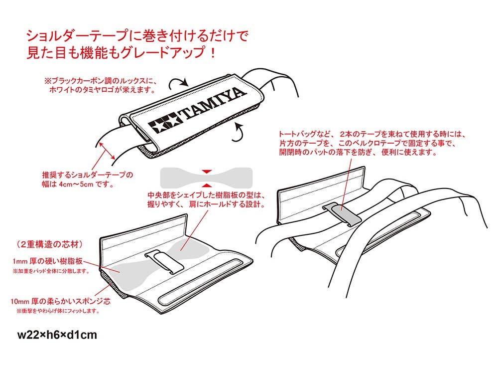 This comfy padded shoulder pad can be attached to a range of bags, to make carrying all your Tamiya supplies more comfortable! It also makes the bag less likely to slip. Very handy, and features the simple but cool Tamiya logo!
