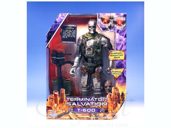 Check out this 10-inch action figure of the T-600 that comes with a removable human face mask, and features eyes that light up at the press of a button! It can be armed with the included gatling gun that can rotate when the ammo belt is pulled. Two test button batteries are included. Produced by Playmates, this item has a Hot Toys sticker (Japanese text) on the bottom of the box to sell it in Japan.Please note that the photos shown are of a prototype; the production version may vary. Also, figures such as this are mass produced and as a result some inconsistencies in finish and painting may occur; these are not considered manufacturer's defects. If you absolutely must have perfection, prepare to do some touch-up work on your own.