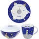 Koniz is a German ceramics manufacturer that has been producing high-quality tableware for 108 years and counting! This charming set of a porcelain bowl, plate and mug feature The Little Prince wishing you "Good night!" The plate is 19cm in diameter; the mug is 10cm by 7.6cm; the bowl is 12.5cm by 6.5cm, and all are microwave and dishwasher safe.