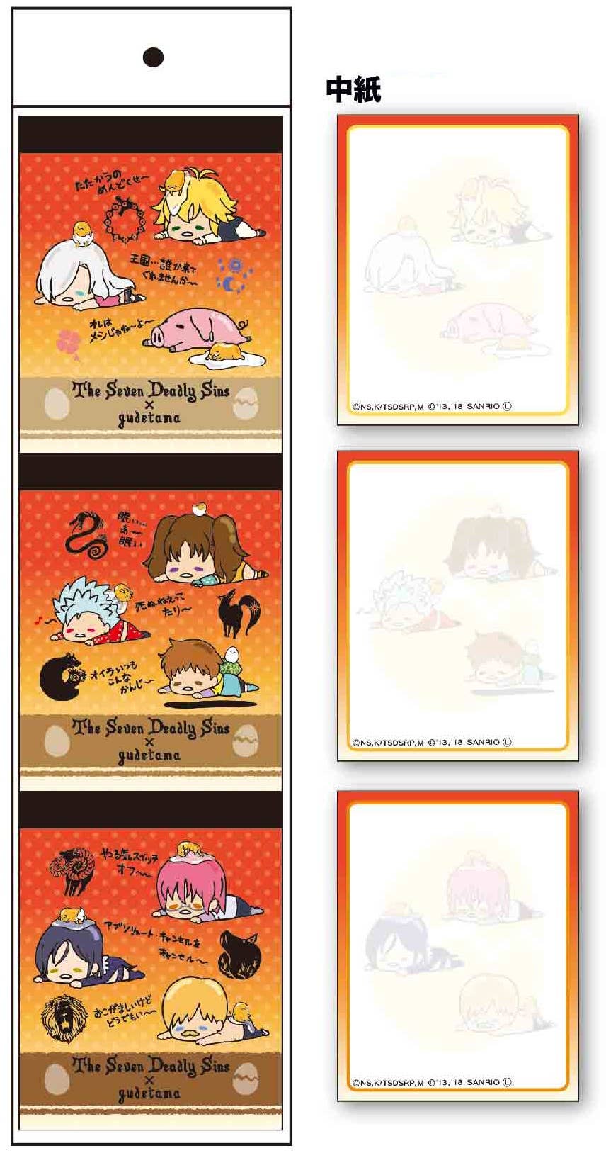 The adorable egg character Gudetama teams up with "The Seven Deadly Sins" for a whole different type of sin! This set of three memo pads features Meliodas, Elizabeth, Hawk, King, Ban, Diane, Gowther, Merlin and Escanor drawn in Gudetama's cute but lazy style, laying down as if they've given up. Order today!