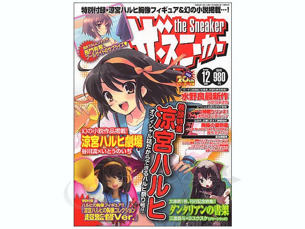 This monthly publication features chapters from various ongoing light novels. There are some illustrations, but the issue is mostly text. This issue features light novel chapters from Bibliotheca Mystica de Dentalian, Suzumiya Haruhi Gekijyou, A Brave Heart of Red Rose, Toki no Ririnne!, Bladeline, Lens & Diabolism, The Black Cats Codex Embolium, and more. A Fraulein Revoltech Haruhi Suzumiya Super Director version bust model is included. The model is poseable and can be used with Kaiyodo's Fraulein Revoltech Haruhi Suzumiya action figure. All text is in Japanese. 318 pages (54 in color).