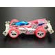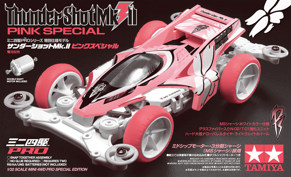 This assembly kit creates a Pink Special version of the popular Thunder Shot Mk.II. The model runs on the MS chassis, which has a 3-section setup that can be put together and taken apart speedily. Pink is the color chosen for the Thunder Shot Mk.II body, with white chassis parts and stylish stickers rounding off the look. N-02 and T-01 units are molded in glass fiber-reinforced ABS resin. Lightweight wheels are molded in white and paired with fluorescent pink arched tires.