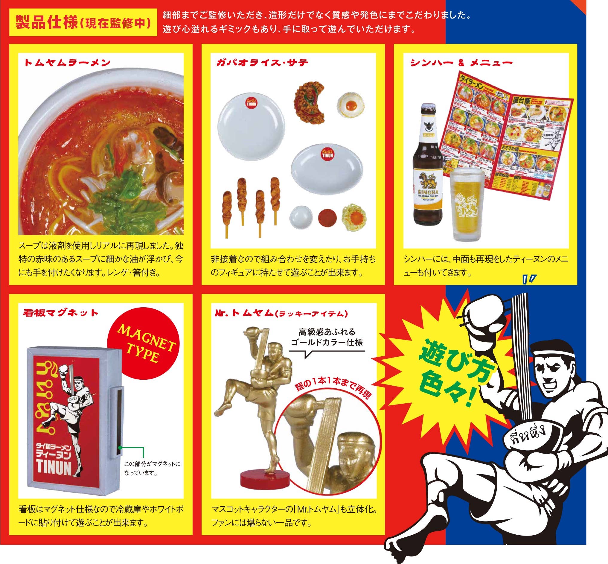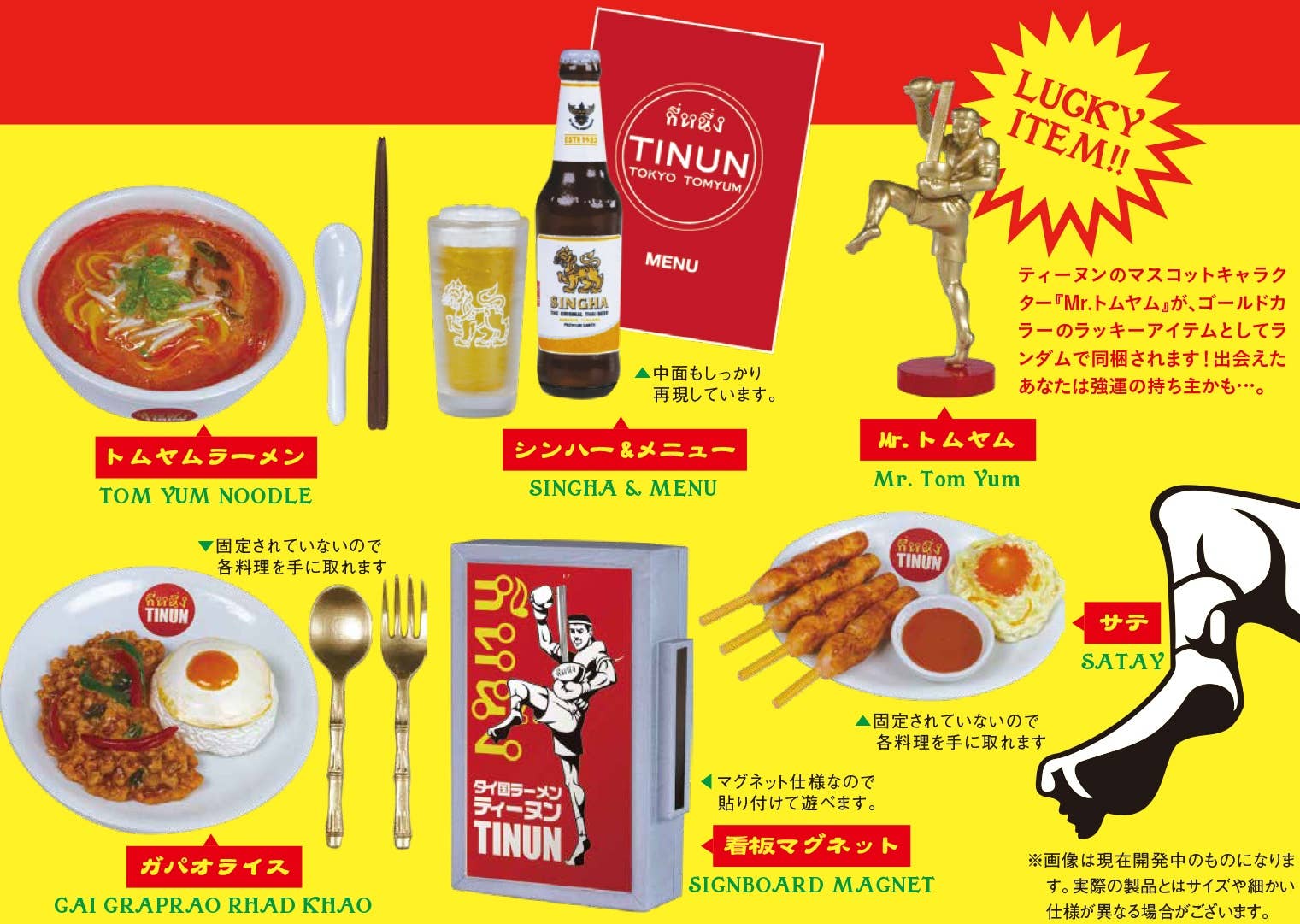 Thai food is beloved all over the world, and the popular Thai ramen specialty restaurant "Tinun" (with 18 locations, mainly in Tokyo) now collaborates with Ken Elefant for a series of miniatures of dishes found at their restaurant! In addition to the five possible food and service items, a special rare figure of their mascot, Mr. Tom Yum, is also included in some boxes in a special gold color! Randomly packed in boxes of 12 -- place your order today!
