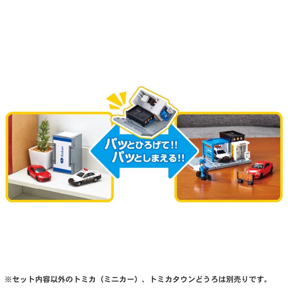 The police box comes with a garage. You can park separately sold Tomica cars and play together.