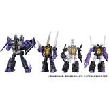 The "Decepticons Part 2" set features the elite Decepticons Skywarp, Kickback, Shrapnel, and Bombshell. Skywarp is a member of the Decepticon air force, the Seekers, and is a pilot who transforms into a jet plane. Kickback, Shrapnel, and Bombshell are members of the independent Insecticon unit, and are featured for their cunning and greedy natures. They transform into a grasshopper, stag beetle, and rhinoceros beetle, respectively. In addition to various weapons, the set also includes small accessories recreating the iconic alt modes of Megatgron, Shockwave, Soundwave, and Reflector! Order it for your own collection today!