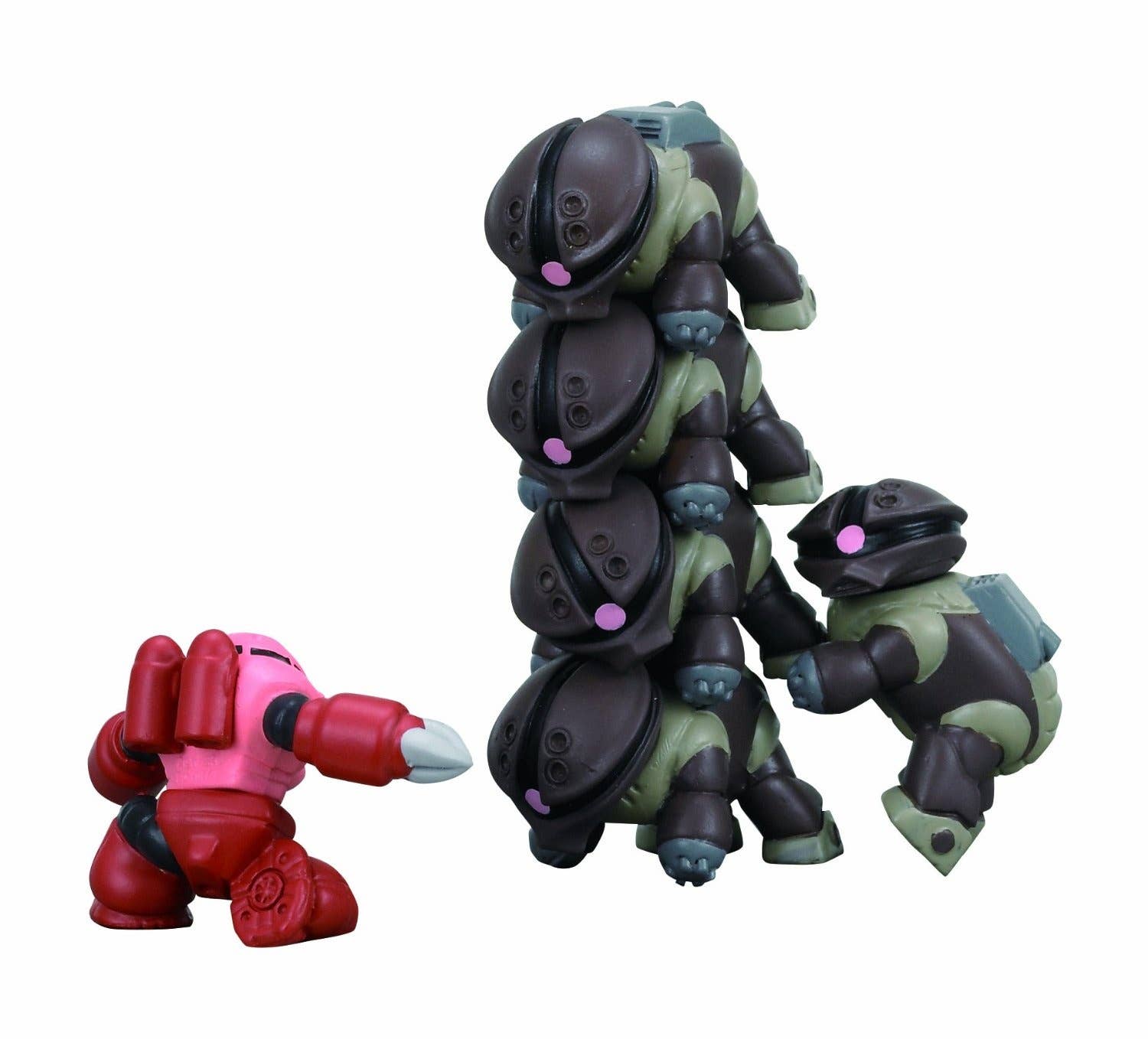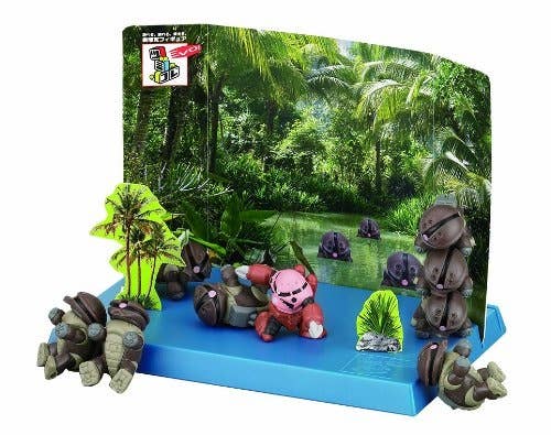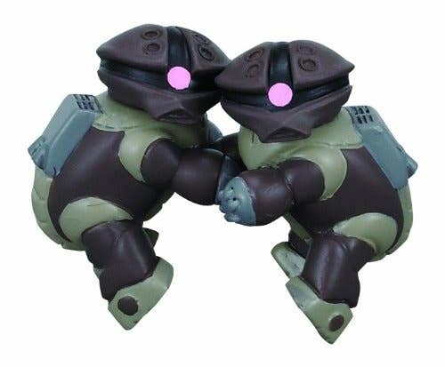 It's an Acguy party! You get 8 plain brown-and-green Acguys, one bright-colored Char-style Z'gok, and a secret item for a total of 10 figures; each is about 3.5cm tall. Pile 'em up, balance 'em on each other, make them have picnics or karaoke contests, or set them up around your cat while he's sleeping and take photos and post 'em on the internet! Two background boards are also included for even more fun. Order today and let the Acguy antics begin!