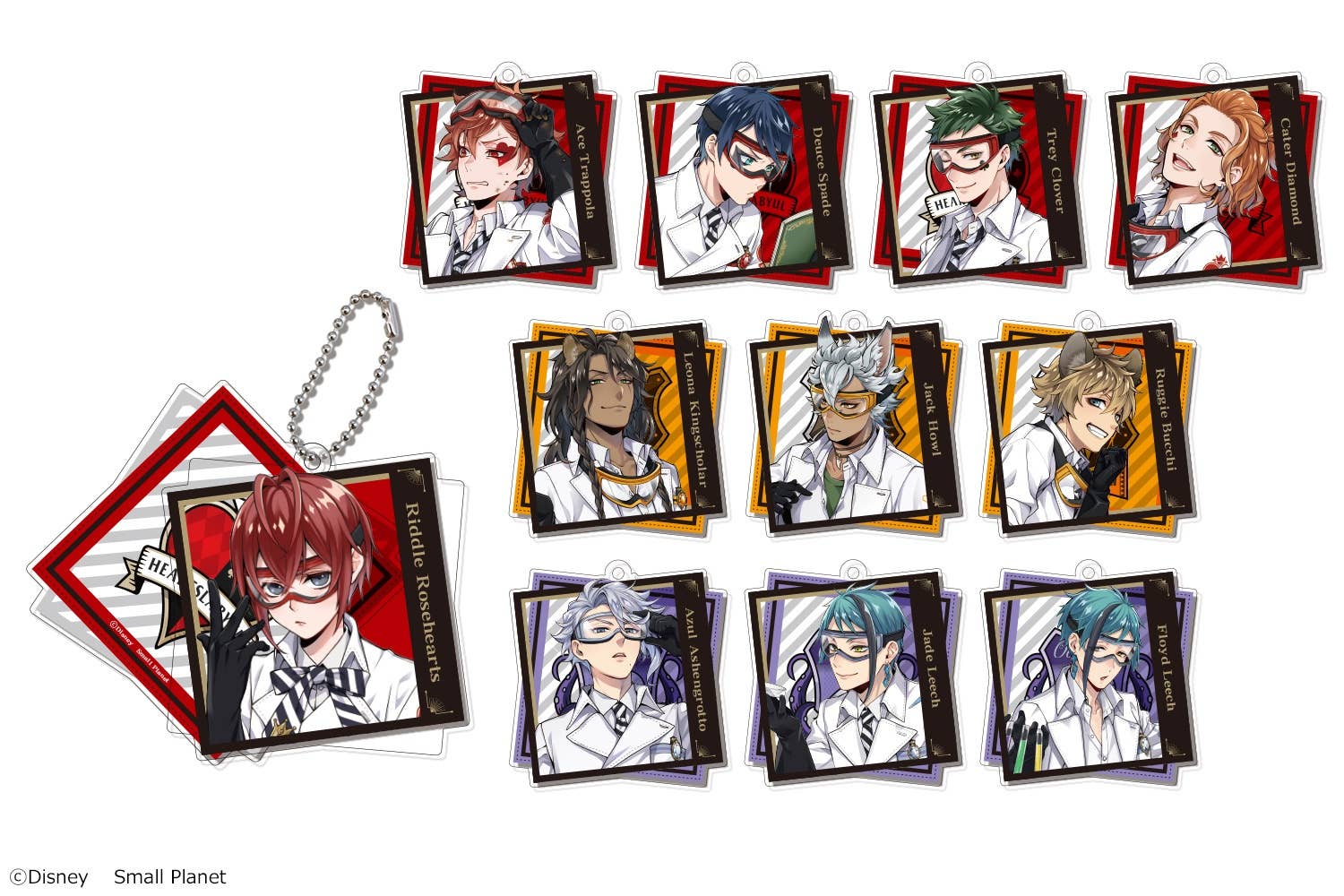 These "Twisted-Wonderland" keychains feature a character part and background part that are separate pieces; they can be slid apart with ease! There are 11 possible images to collect and trade; you'll receive one of each in the box. Order yours now!