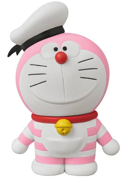 Doraemon sports a sailor's hat and stripes for the "Nobita's Treasure Island" movie! This Ultra Detail Figure features a pink color scheme and stands about 57mm tall.