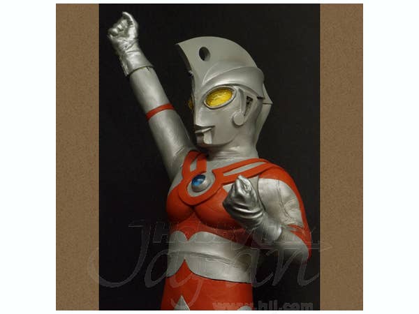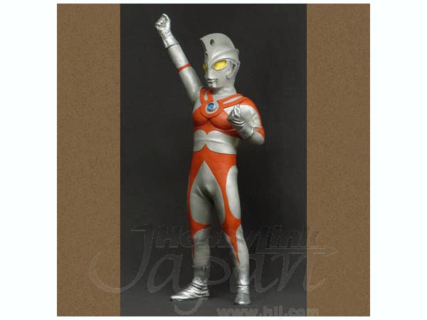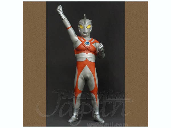 Highly detailed and fully-finished fixed-pose soft vinyl figure of Ultraman Ace, in his "Here I am to save the day!" pose. Stands about 27cm to the top of his upraised right hand.