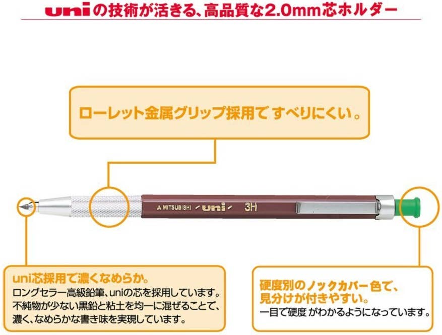 From Uni Mitsubishi comes this high quality 2.0mm mechanical pencil lead holder. The textured metal grip makes this mechanical pencil perfect for detailed drawings, design and writing. The body is also made from smooth plastic allowing for long use and comes with a removable clip at the top. Furthermore the special clutch system grips the lead firmly removing any chance of slippage or breakage. Apply varying levels of force to control shading and drawing contrast levels. This 3H variety has the according markings on the body and should be used with 3H grade lead.
