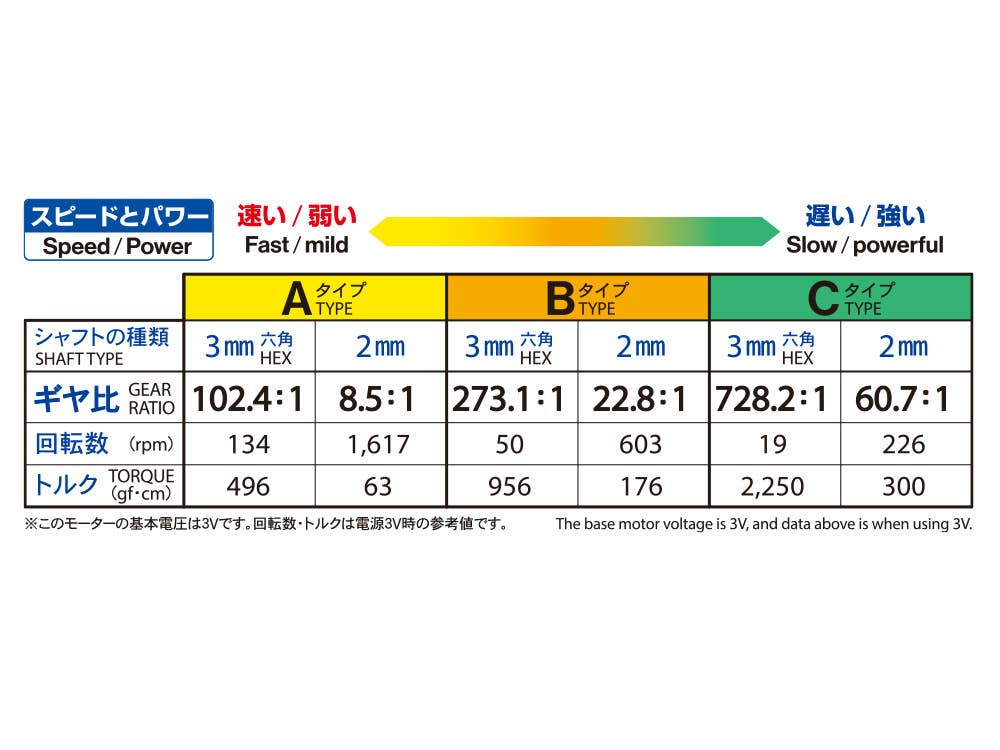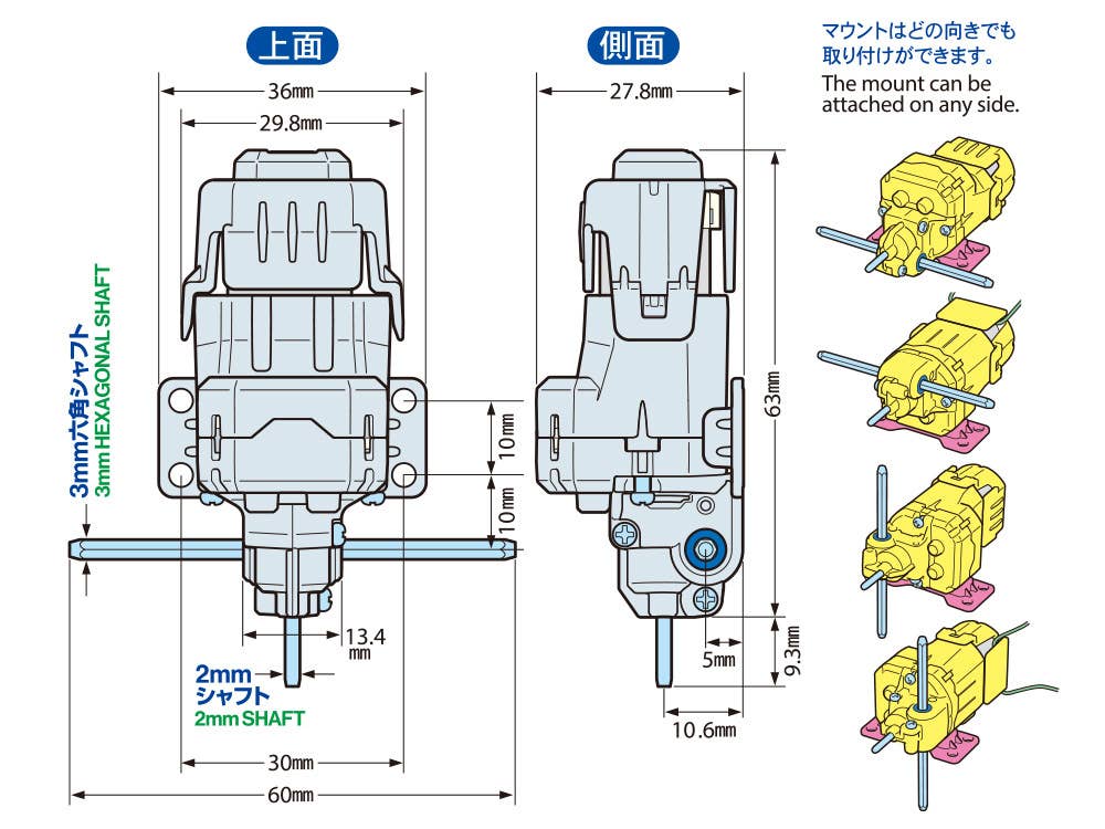 - Both 3mm hex shafts and 2mm shafts allow you to choose from three gear ratios.