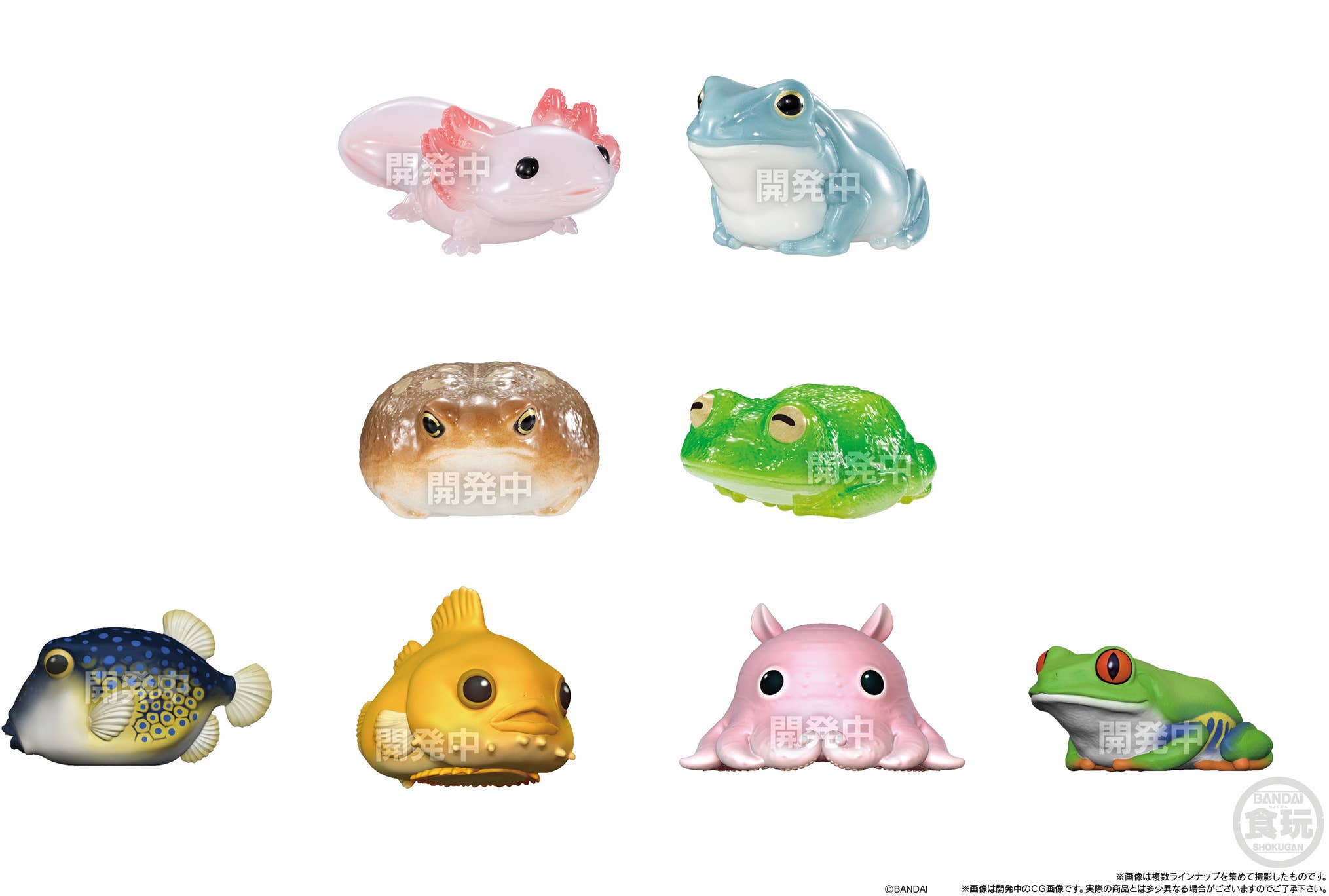 Bandai's new "Urutsuya Tenori Friends," a new series recreating creatures from the water and sea, each has a special coating that makes them look dewy and glossy! Offering a fresh aesthetic distinct from previous "Tenori Friends" releases, these figures boast a vibrant, lifelike appearance that you'll love! In addition to popular favorites such as frogs and axolotls, the lineup also includes newly sculpted figures of the Red-Eyed Tree Frog and Boxfish! Each figure comes with a piece of soda-flavored gum; there are eight different friendly creatures to collect and trade, randomly packed in boxes of 12. Place your order today!