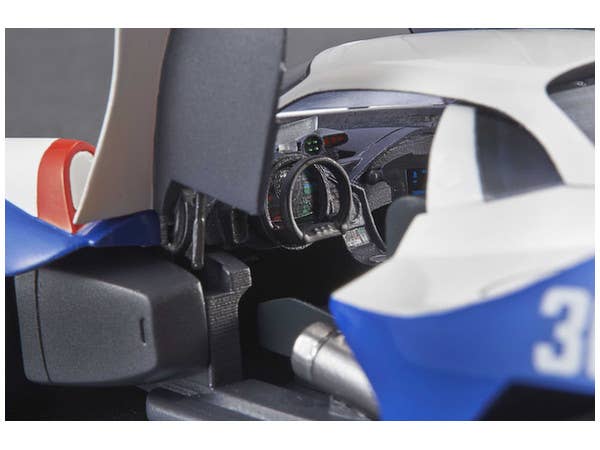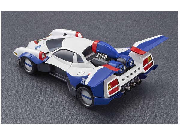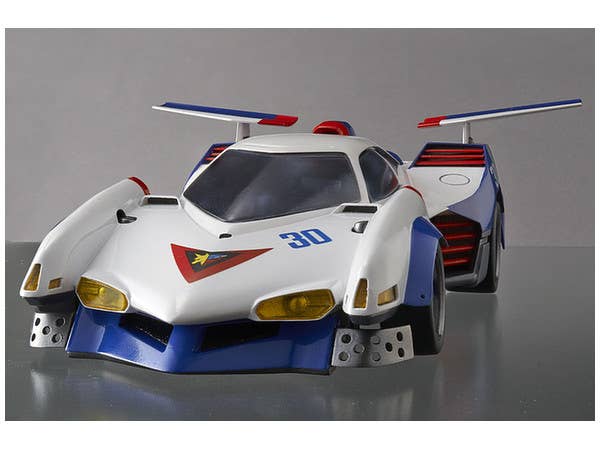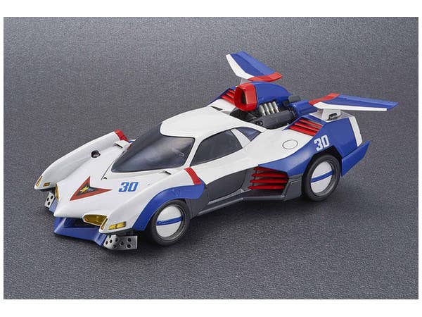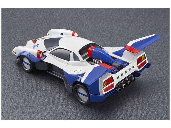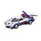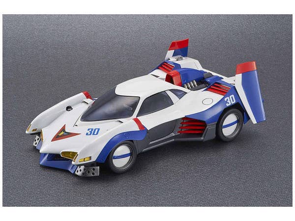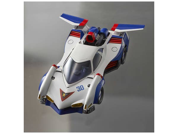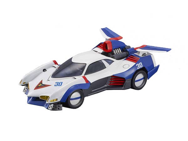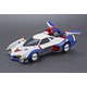 Driven by Hayato Kazami in "Cyber Formula," the Asurada G.S.X. is one of the many highly advanced "cyber machines" featured in the anime. The Variable Action version of this legendary racing vehicle features a hatch that can be opened and closed, a boost pod that can be placed in the on or off position, and the wings can be deployed. A figure of Hayato is also included, and diecast parts give this item durability. A base is included for display; it's about 18cm long.