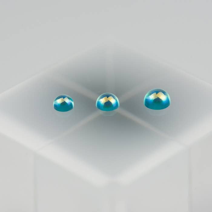 The surfaces of these ocean-blue glass domes shine with a mysterious color-changing effect thanks to their polarised coating! They're perfect for sensors and lenses of mechanical models, custom figures, etc. -- use your imagination! You get three each of 3mm, 3.5mm and 4mm sizes, for a total of 9 pieces.