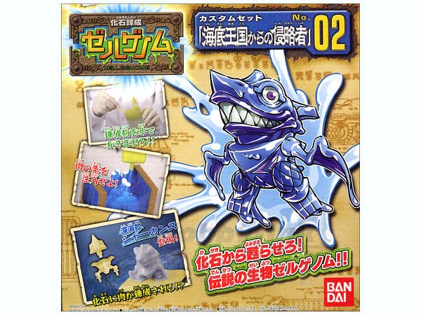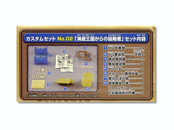 Create a Sharkans Xellgenome creature with this custom set! You get four XG molding blocks (two slots), two packets of water-colored XG Monster Powder, two "space-time binders," a simple stick, an XG fossil plastic runner, a Xellgenome custom display base, a syringe, and a jar.