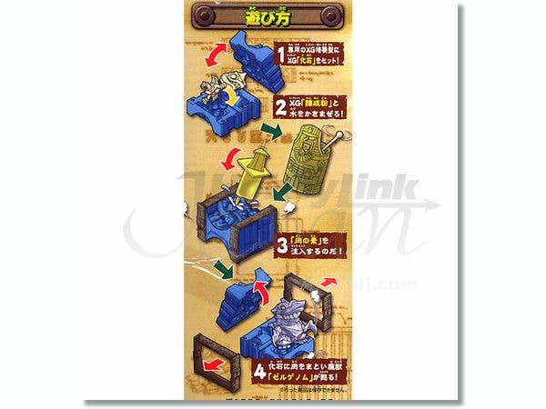 First, assemble Sharkans' fossil and place it inside its molding blocks. Mix one packet of XG Monster Powder with water and stir it inside the jar. Fill each molding block with the mixture by using the syringe, and secure the blocks with the space-time binders. Let the mixture set for about 20 minutes and then remove it from the molding blocks. Carefully remove any excess material with the stick, and you'll then have a completed jelly-like Sharkans model! Afterwards, Sharkans can be dissolved into liquid by adding XG Melting Powder (sold separately) on top of the model to melt it back down to its fossil.
