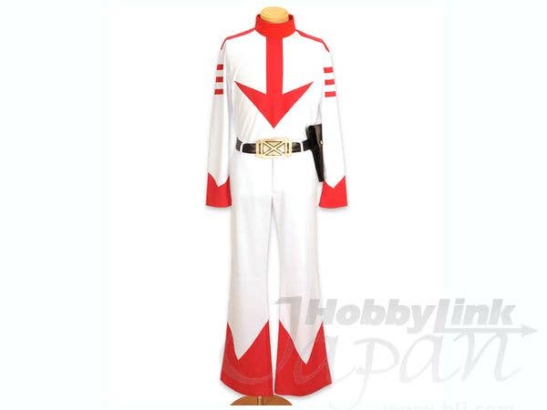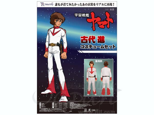 Cospa provides a striking interpretation of Kodai's bridge uniform as seen in the "Space Cruiser Yamato" TV series and movies! Includes the jacket and pants, both made of 100-percent polyester, with a belt and holster (no gun is included) of urethane. The belt fastens with hook-and-loop tape. This is size L, to fit someone between 175 and 185cm tall, with a chest measurement of 96cm to 105cm, waist from 77cm to 88cm, and hips from 100cm to 108cm.Wig and idealistic attitude not included.