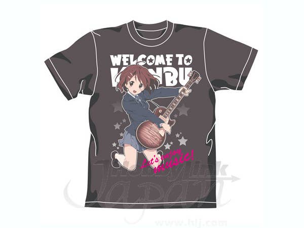 "Let's enjoy music!" Yui Hirasawa rocks out on her Gibson Les Paul Classic just for you on this charcoal-brown T-shirt! Made of 100-percent cotton for comfort and durability. Length (shoulder to hem): 77cm. Width (measured flat, under the arms, one side only): 58cm.